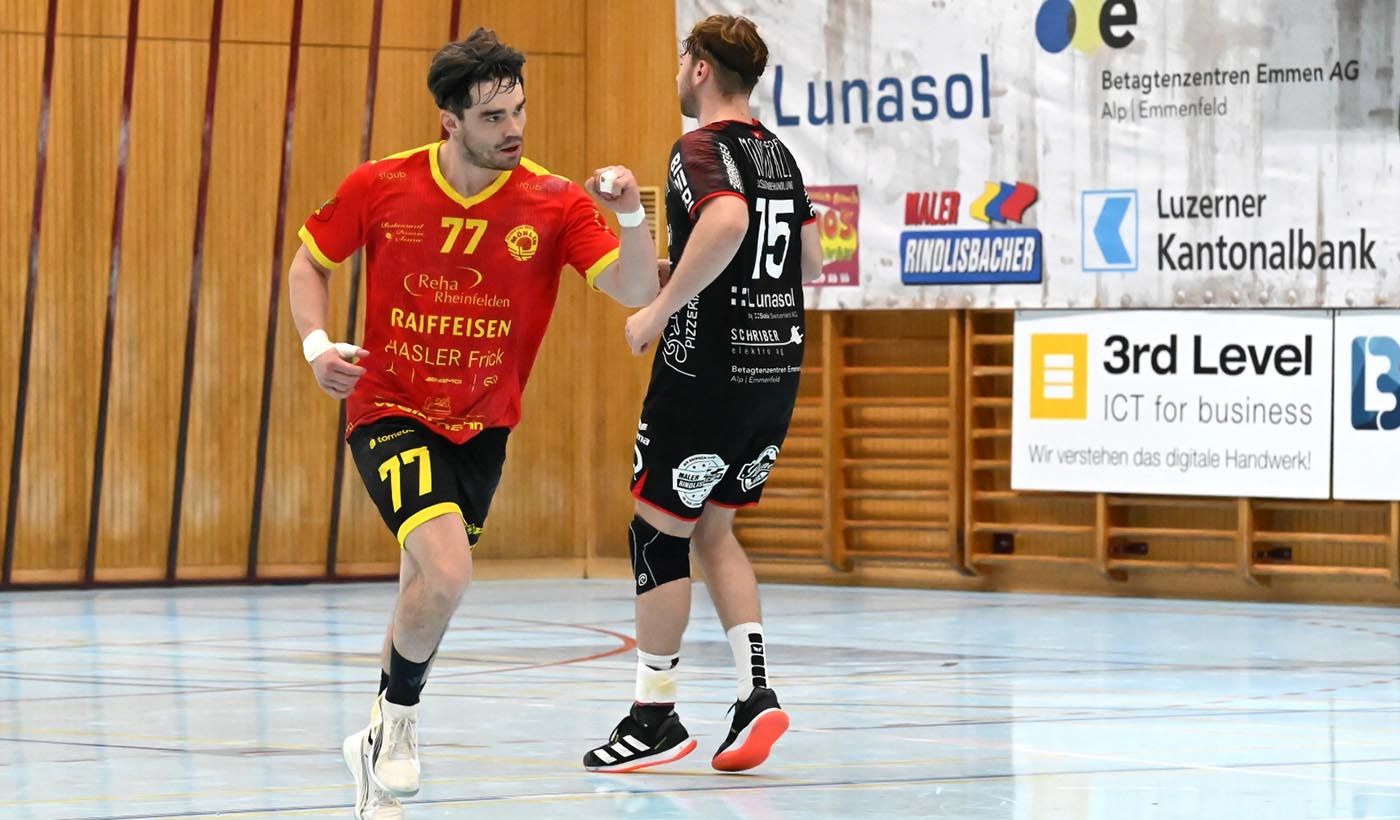 Trotz einer frühen Zeitstrafe gegen Rückkehrer Jonathan Ulmer zu Beginn der zweiten Hälfte konnten die Fricktaler den Vorsprung bei zwei Toren halten. Nach dem Tor zur vier Tore Führung durch Jan Waldmeier in der 40. Minute zog Manu Schnellmann, Trainer der Heimmannschaft, das Team-Timeout und unterbrach so den Lauf der Gäste. Die Gastgeber konnten das Ruder herumreissen und in der 50. Minute mit zwei Toren in Führung gehen. Die Gäste aus dem Fricktal stemmten sich mit aller Kraft gegen die Niederlage und versuchten alles, um das Momentum wieder auf ihre Seite zu ziehen, doch die Kraft reichte nicht mehr aus. Am Ende konnte sich Handball Emmen mit dem Schlussstand von 35:33 Toren die zwei Punkte gutschreiben lassen.