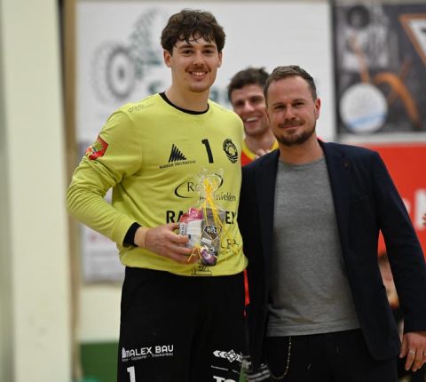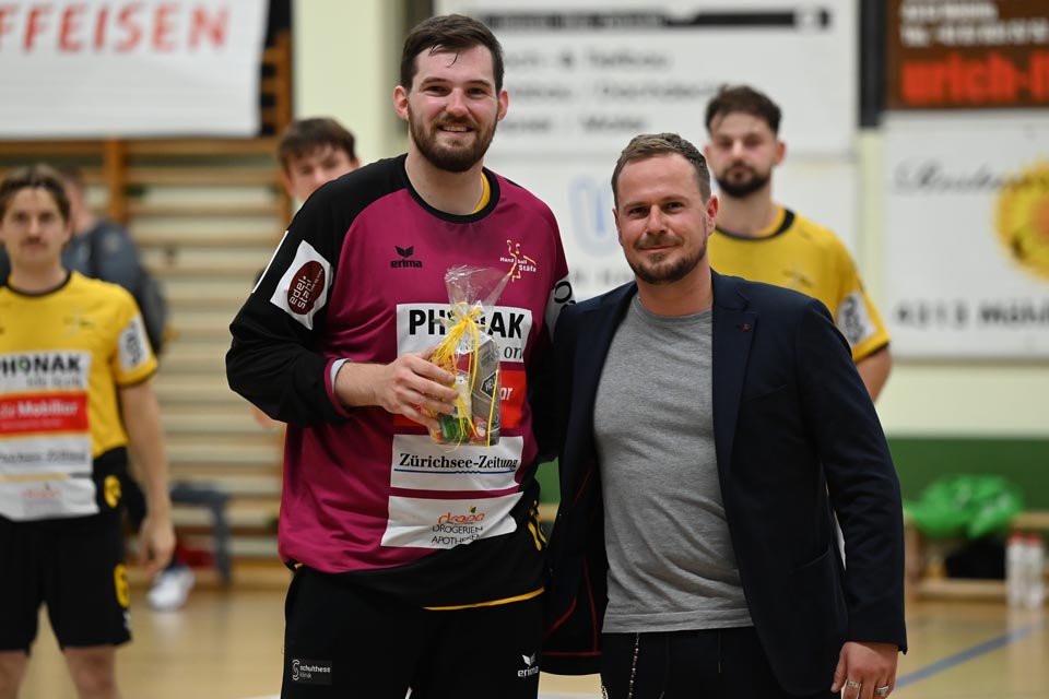 Best Player überreicht von Matthias Wiedmer (MHW Herrenmode): Luca Frei (Stäfa) mit 58%-Abwehrquote und Robin Santeler (Möhlin) u.a. für seine zwei parierten Siebenmeter!
