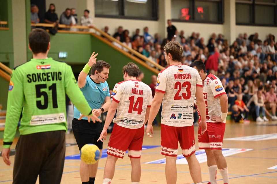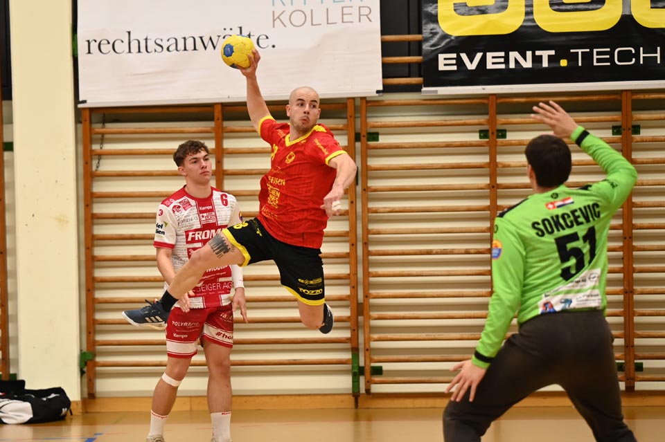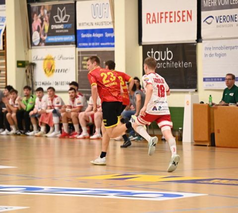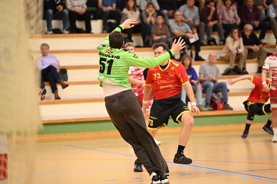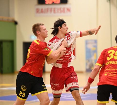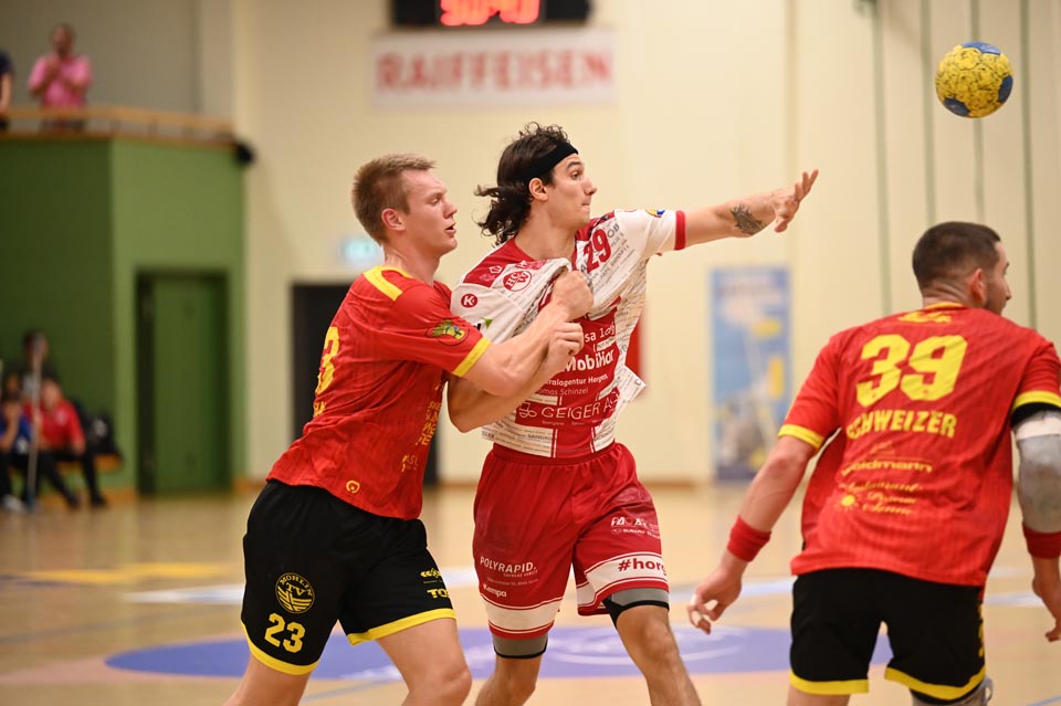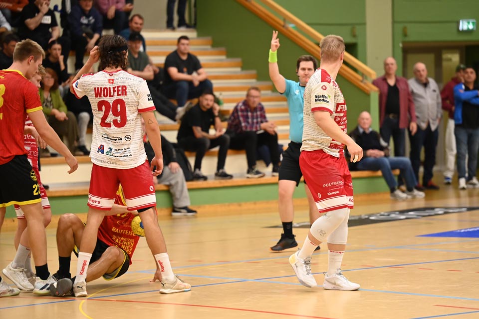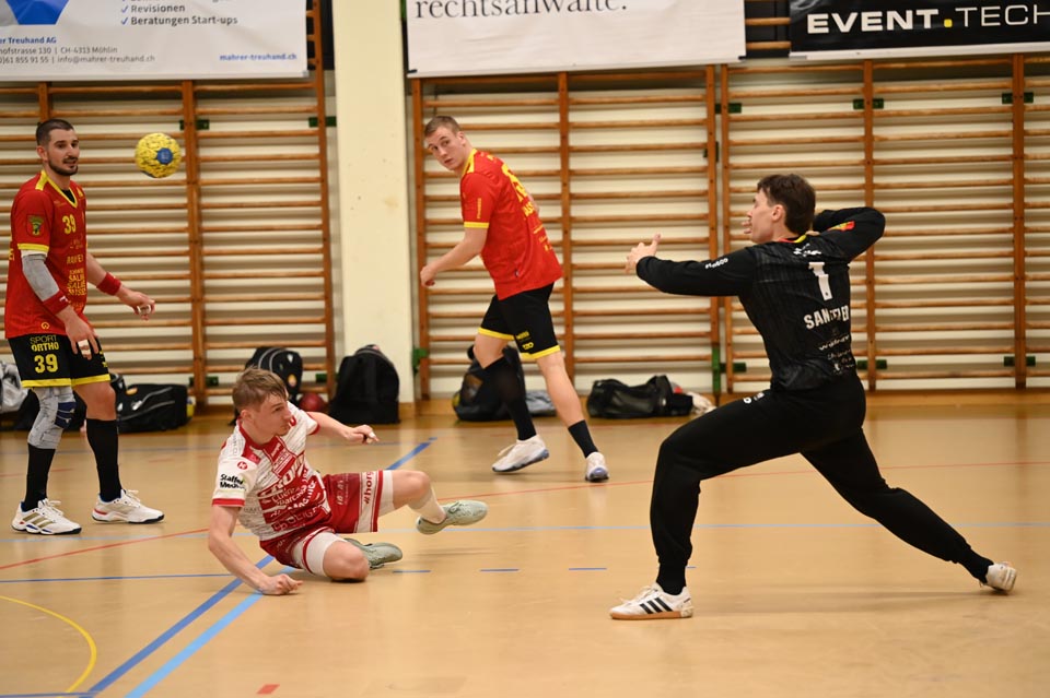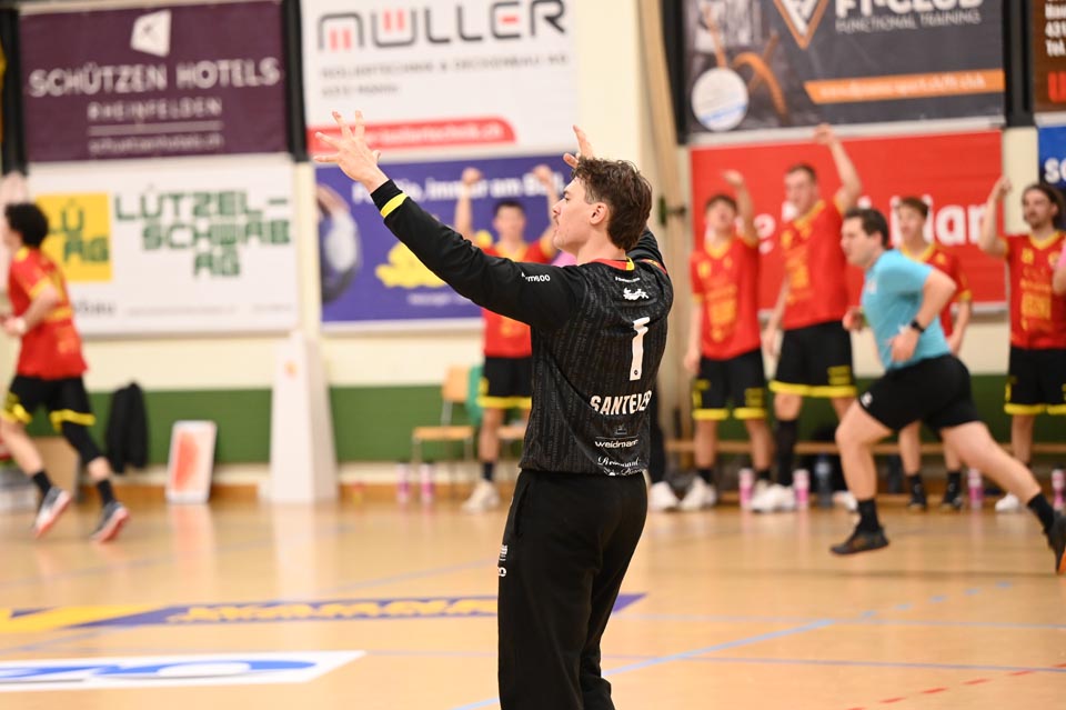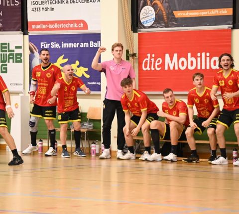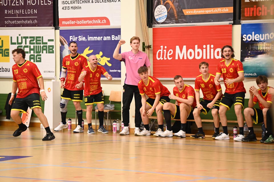 Danach kassierte Möhlins Topscorer Grandi eine Zeitstrafe. Als zusätzlicher Feldspieler wurde der junge Fynn Soder eingewechselt und er tankte sich blitzschnell durch und erzielte das 10:9. Nach zwei weiteren Santeler-Paraden und einem Tor durch Lucas Grandi, musste auch Kreisläufer Mitch Giezeman auf die Bank und die Gäste warfen den Anschlusstreffer zum 11:10 (22.). Die nächsten Minuten waren geprägt von Wurffehlern auf beiden Seiten, erst Ruben Ribeiro setzte ein Ende und stellte auf plus zwei. Möhlin zog aber nicht wirklich davon, obwohl die Gäste mit mehreren Zeitstrafen taktieren mussten. Zuerst hielt Luka Sokcevic gegen den treffsicheren Flügel Jan Waldmeier, danach hatte auch Ruben Ribeiro das Nachsehen vom Siebenmeter. Folglich ging man mit einem «offenen» 14:12 in die Halbzeitpause.