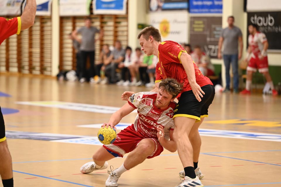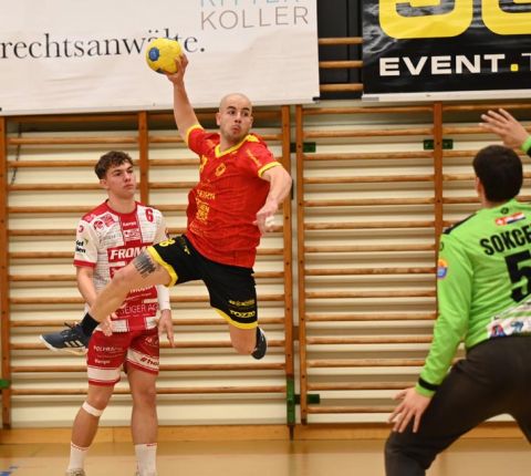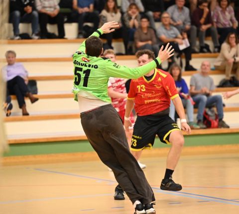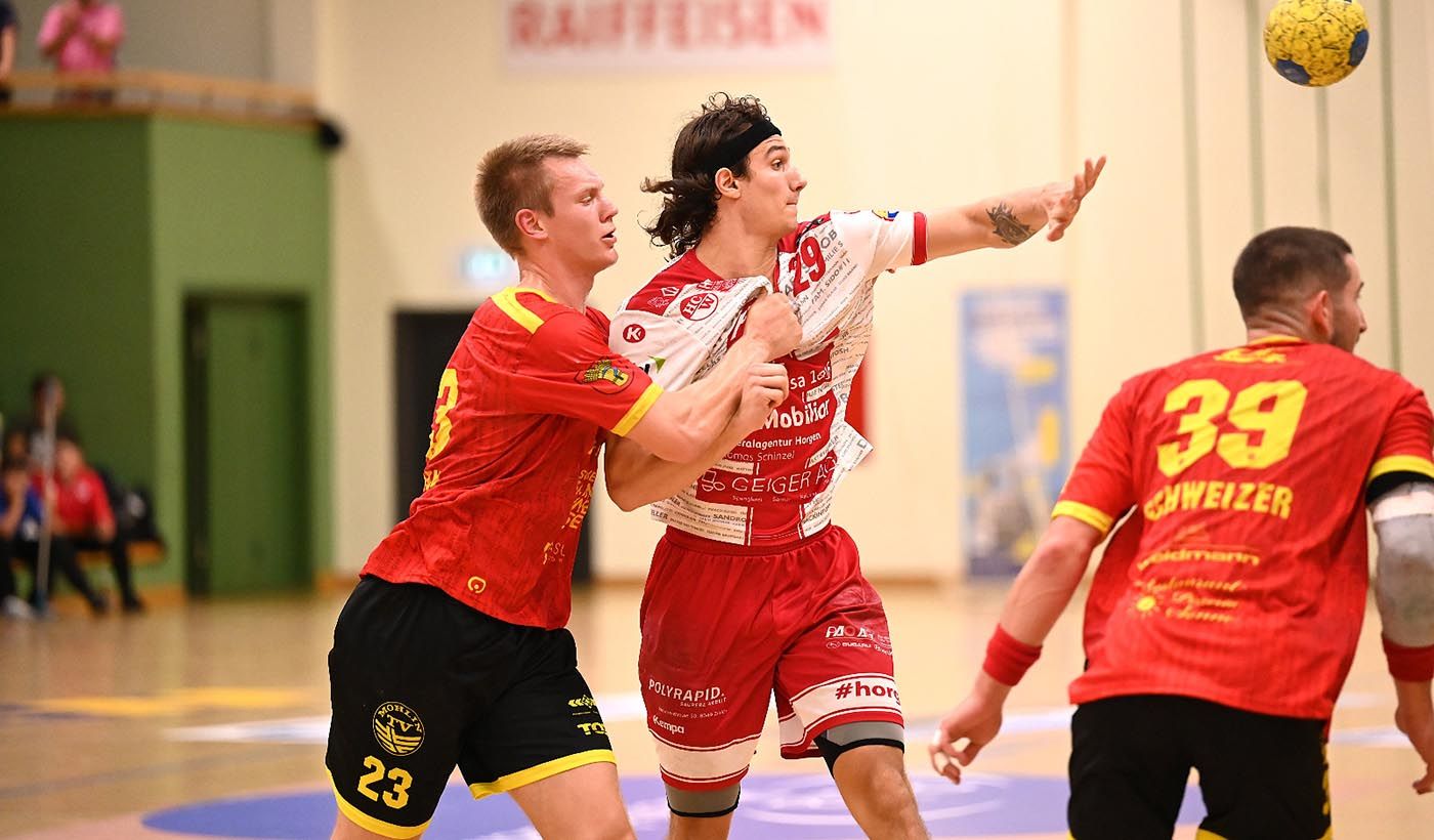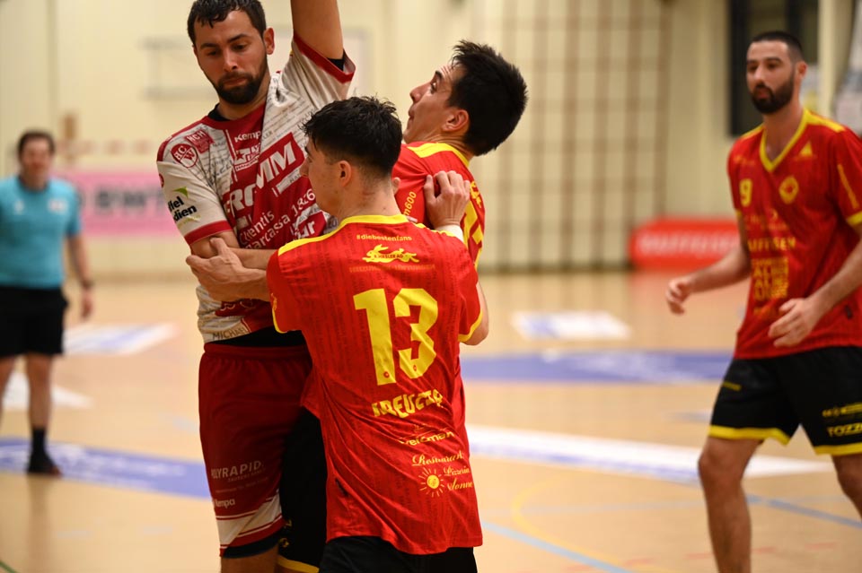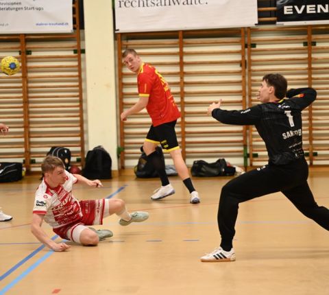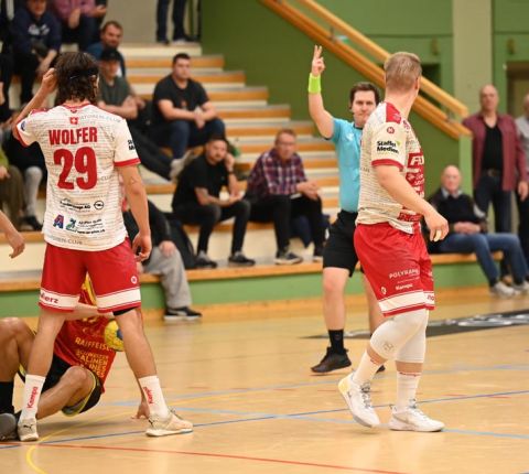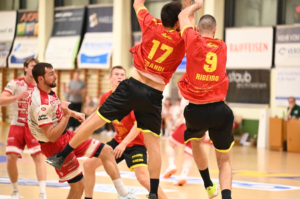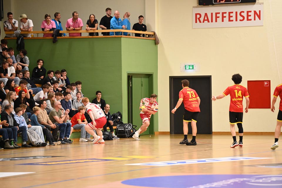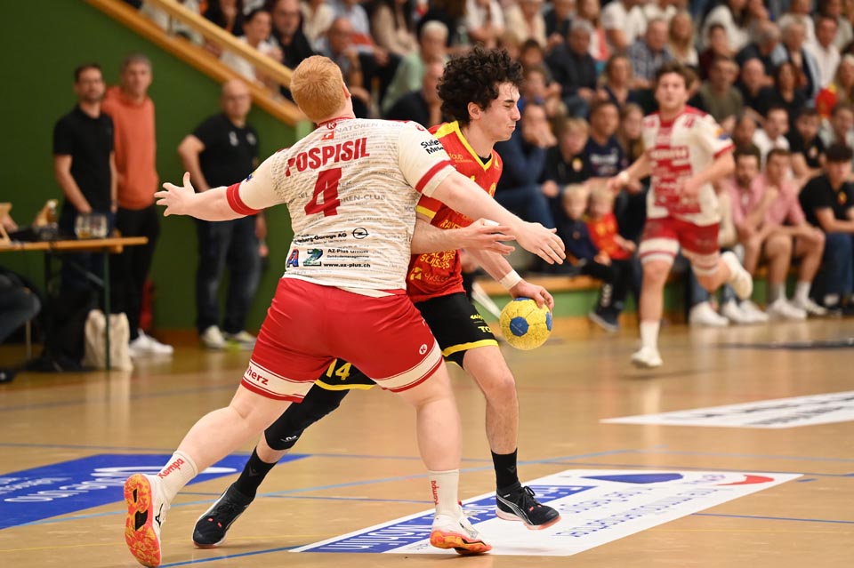 Danach kassierte Möhlins Topscorer Grandi eine Zeitstrafe. Als zusätzlicher Feldspieler wurde der junge Fynn Soder eingewechselt und er tankte sich blitzschnell durch und erzielte das 10:9. Nach zwei weiteren Santeler-Paraden und einem Tor durch Lucas Grandi, musste auch Kreisläufer Mitch Giezeman auf die Bank und die Gäste warfen den Anschlusstreffer zum 11:10 (22.). Die nächsten Minuten waren geprägt von Wurffehlern auf beiden Seiten, erst Ruben Ribeiro setzte ein Ende und stellte auf plus zwei. Möhlin zog aber nicht wirklich davon, obwohl die Gäste mit mehreren Zeitstrafen taktieren mussten. Zuerst hielt Luka Sokcevic gegen den treffsicheren Flügel Jan Waldmeier, danach hatte auch Ruben Ribeiro das Nachsehen vom Siebenmeter. Folglich ging man mit einem «offenen» 14:12 in die Halbzeitpause.