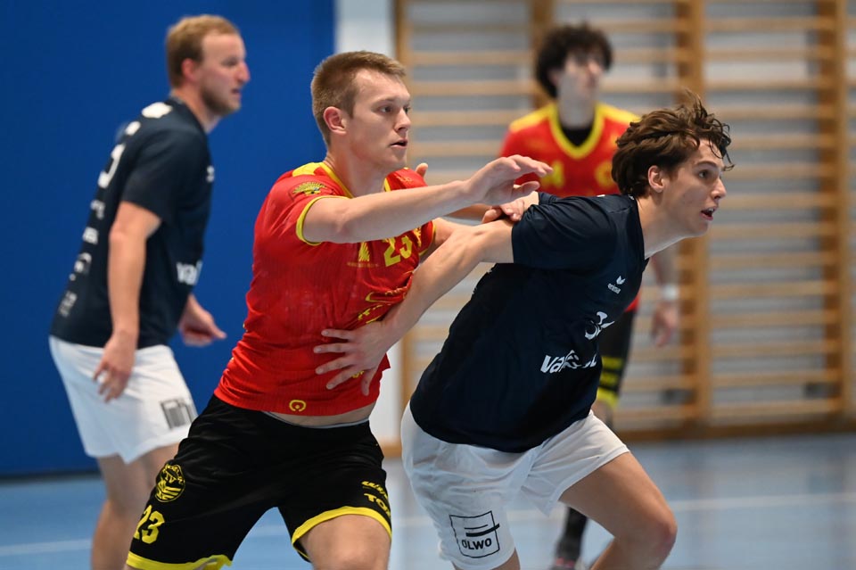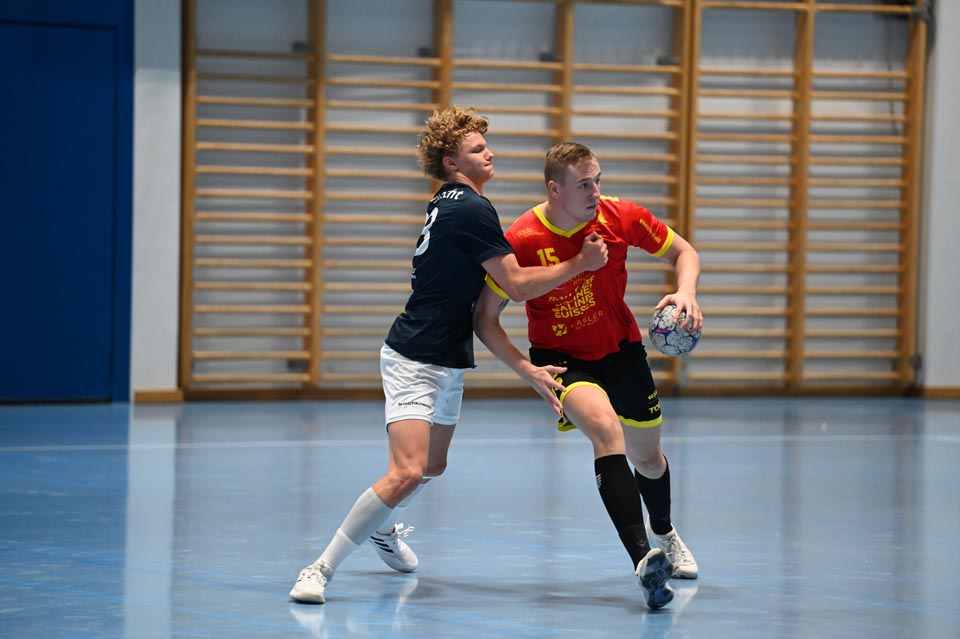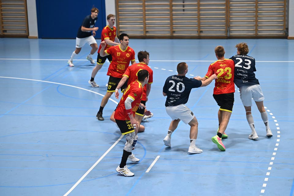 Kapitän Fabian Ceppi musste von Beginn weg viel Verantwortung auf der Spielmacherposition übernehmen und bescherte seinem Team in der vierten Spielminute den ersten Siebenmeter. Zwar scheiterte der sonst treffsichere Sadok Ben Romdhane vom Strich, aber wenig später warfen nacheinander Finn Kreuzer und Lucas Grandi den Ball übers Feld ins verwaiste Steffisburger Tor zur erstmaligen Zwei-Tore-Führung (5.). Die Gastgeber reagierten durch Treffer ihres Topscorers Rauls Serafimovics und Flügel Janes Karlen und verkürzten auf 5:6 (11.). Die nächste Zeitstrafe gegen Martin Vulic nutzte Möhlin mit drei tollen Treffern, darunter ein Steal und der dritte Wurf ins leere Gehäuse. Nach den Toren von Jan Waldmeier und Ben Romdhane zum 6:10 (14.) musste Finn Kreuzer auf die Bank. Die nachfolgende wichtige Parade von Robin Santeler gab seinen Vordermännern Aufwind und Grandi liess einen Kraftwurf folgen, der das 6:11 einläutete. Eine kurzzeitige doppelte Unterzahl meisterte Möhlin souverän, aber die Gastgeber blieben dran und schweissten manchen Ball sehenswert ein. Weil aber Möhlin nichts an seiner Offensivpower verlor, nahm Trainer Sven Krainer beim 8:13 (19.) die erste Auszeit. Nach zwei erfolgreichen Steffisburger Abschlüssen reagierte Möhlin und besprach sich ebenso am Spielfeldrand. Vorne liess man danach sehenswerte Treffer zum Sechs-Tore-Vorsprung notieren. Es folgten umstrittene Spielszenen mit Zeitstrafen und eine Verwarnung an den Gastgebertrainer, die den Spielfluss ins Stottern brachten. Resultatmässig erarbeitete sich Möhlin, trotz vergebener Chancen, ein kleines Polster zum 16:21-Pausenstand.